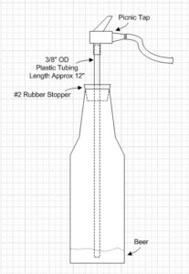 The operation is even simpler: you will need to relieve the keg pressure to 5 PSI first. Then place the tube in the bottle and press the rubber stopper down over the mouth of the bottle. Open the tap and put it in the locked open position; as the pressure equalizes in the bottle the beer will stop flowing. When the beer stops rising just lift up on the tube, to create a leak of air between the stopper and the bottle and beer starts flowing again. When you’re done you can top off the bottle as long as the tube is in the bottle.